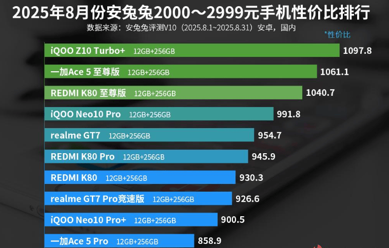 安兔兔公布的2000-3000元手机性价比排行榜中,vivo旗下的iQOO Neo10 Turbo+位列第一名,性价比高出一加Ace5至尊版不少。