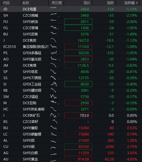 商品:国内商品期货多数下跌,截至发稿,鸡蛋跌超5%,燃油跌超2%,烧碱、集运指数、沥青跌超1%,焦炭、多晶硅、焦煤、氧化铝、纸浆、玻璃、工业硅、锰硅、豆粕等纷纷下跌,沪金、沪银逆势大涨,其中沪金涨超5%。