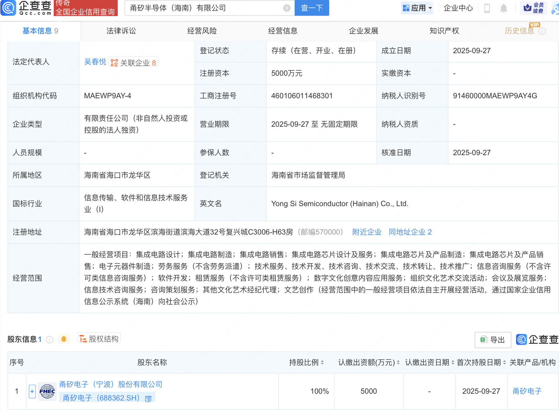 企查查APP显示,近日,甬矽半导体(海南)有限公司成立,注册资本5000万元,经营范围包含:集成电路设计;集成电路制造;集成电路销售;集成电路芯片设计及服务;集成电路芯片及产品制造等。企查查股权穿透显示,该公司由甬矽电子(688362)全资持股。