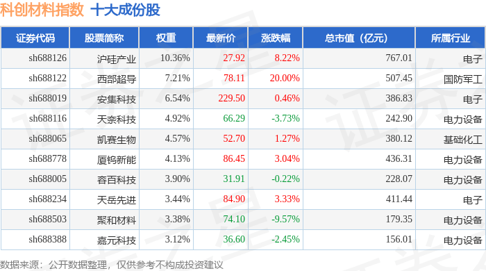 科创材料(000689)指数十大成份股详情如下: