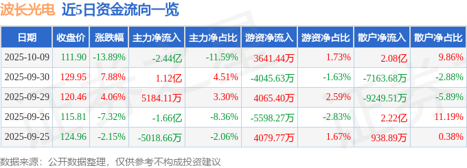 证券之星消息,截至2025年10月9日收盘,波长光电(301421)报收于111.9元,下跌13.89%,换手率39.21%,成交量18.16万手,成交额21.08亿元。