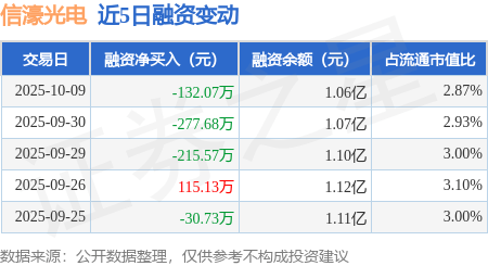 证券之星消息,10月9日,信濠光电(301051)融资买入402.75万元,融资偿还534.82万元,融资净卖出132.07万元,融资余额1.06亿元。