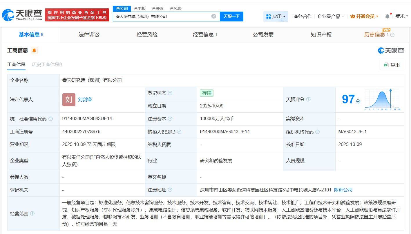 天眼查App显示,近日,春天研究院(深圳)有限公司成立,法定代表人为刘剑锋,注册资本10亿人民币,经营范围包括集成电路设计、人工智能基础资源与技术平台、人工智能理论与算法软件开发等,由中国电子信息产业集团有限公司全资持股。