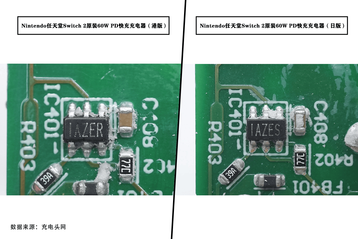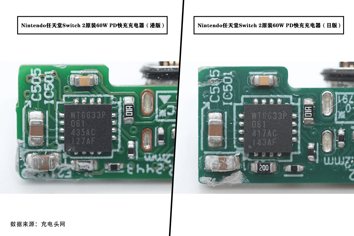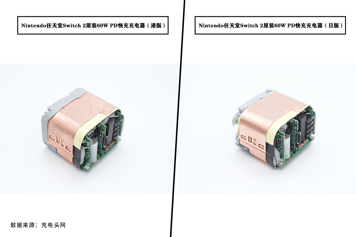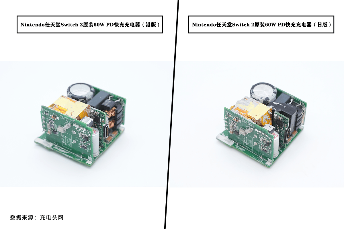 充电头网已拆解了Switch 2港版和日版两个不同版本的原装60W充电器,这次为大家带来两个版本的拆解对比,看看这两个版本在设计用料上都有哪些不同。