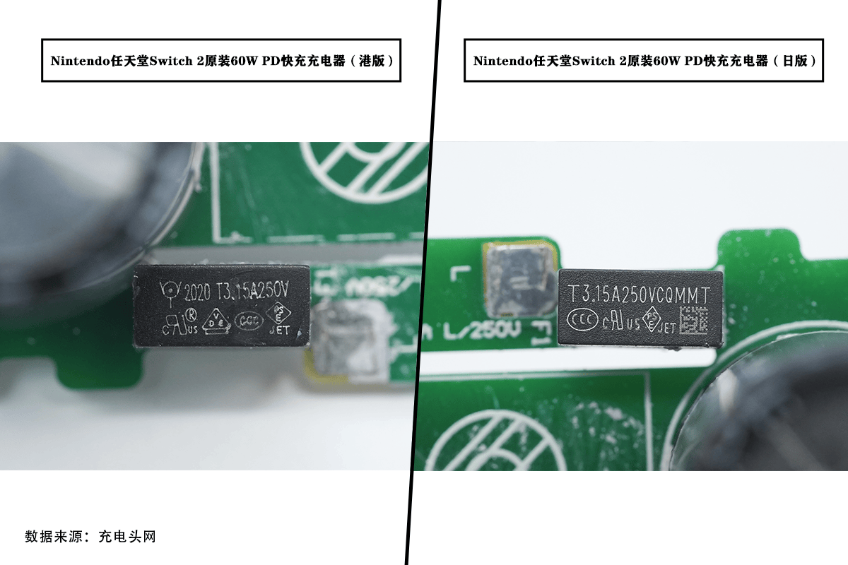 任天堂Switch 2原装60W快充充电器两个版本的延时保险丝有所区别,港版的来自华德电子,规格为3.15A250V;日版的来源未知,但规格同样为3.15A250V。