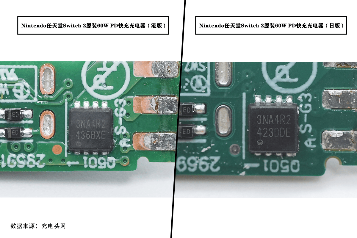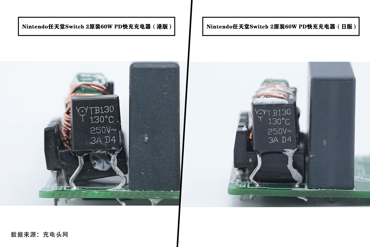 任天堂Switch 2原装60W快充充电器两个版本的温度保险丝型号规格一致,均来自华德电子。