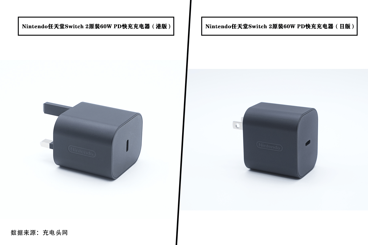 任天堂Switch 2 60W充电器两个版本在样式设计上完全一致,仅在插脚以及机身上的品牌、铭牌布局则有所不同。两个版本均支持PD3.0快充协议,可提供最大60W输出,除给Switch 2供电外,日常使用中,还可以拿来给手机、平板甚至是轻薄笔记本充电。