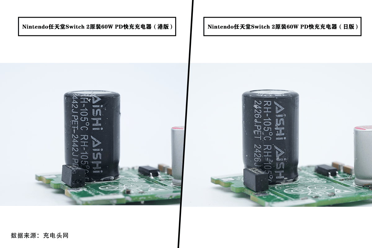 任天堂Switch 2原装60W快充充电器两个版本的高压滤波电解电容型号规格一致,均来自AiSHi艾华,规格为400V100μF。