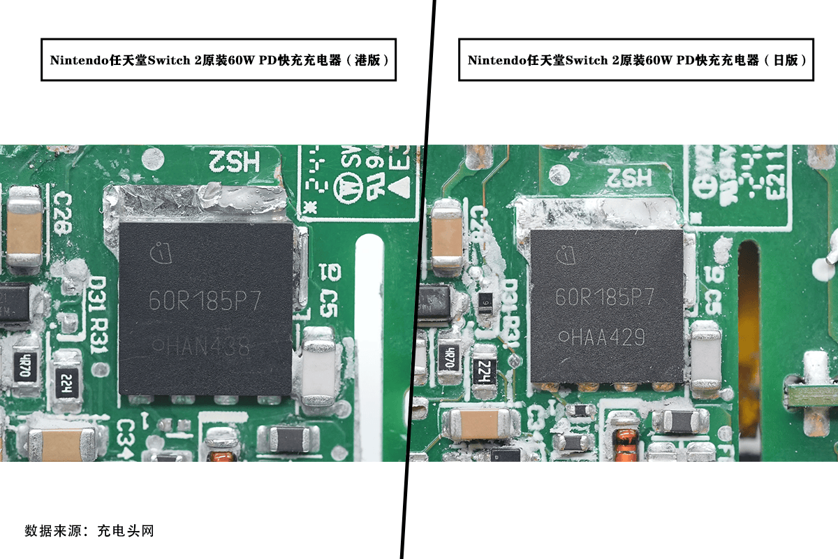 任天堂Switch 2原装60W快充充电器两个版本的初级开关管型号一致,均来自英飞凌,型号IPL60R185P7,属CoolMOS P7系列,耐压650V,导阻185mΩ,采用PG-VSON-4封装。