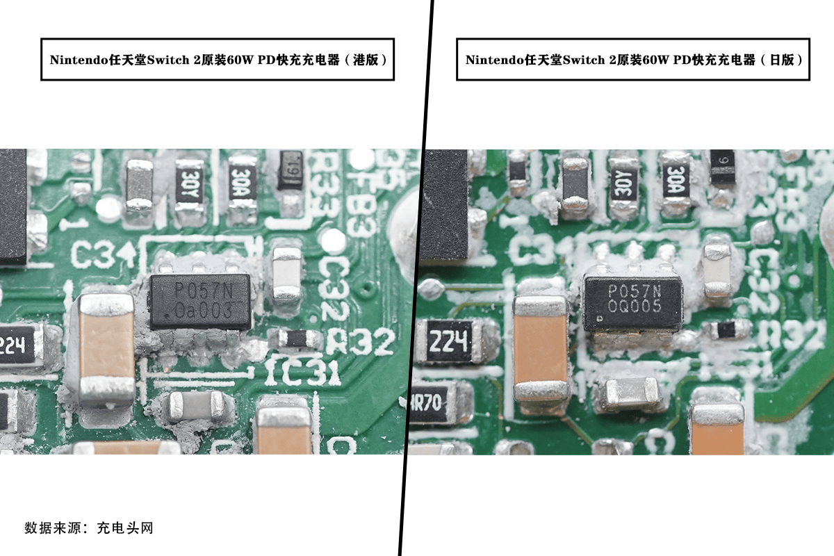 任天堂Switch 2原装60W快充充电器两个版本的初级主控芯片型号一致,丝印P057N,采用SOT23-6封装。