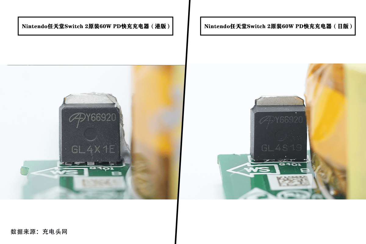 任天堂Switch 2原装60W快充充电器两个版本的同步整流管型号一致,均来自AOS万国半导体,型号AOY66920,耐压100V,导阻8.2mΩ,采用TO251B封装。