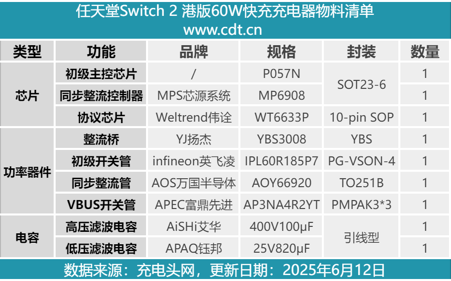 任天堂Switch 2 日版60W快充充电器物料清单如上表所示。
