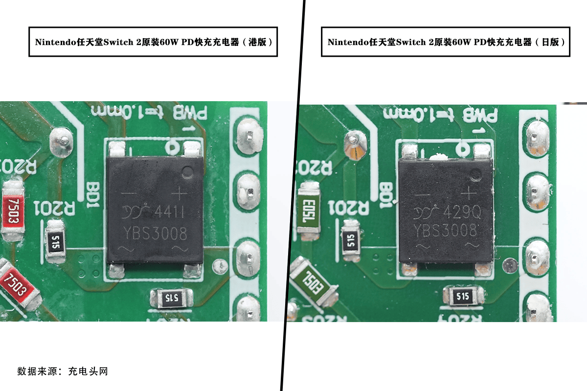 任天堂Switch 2原装60W快充充电器两个版本的整流桥型号一致,均来自扬杰,型号YBS3008,规格为3A 800V,采用YBS封装。