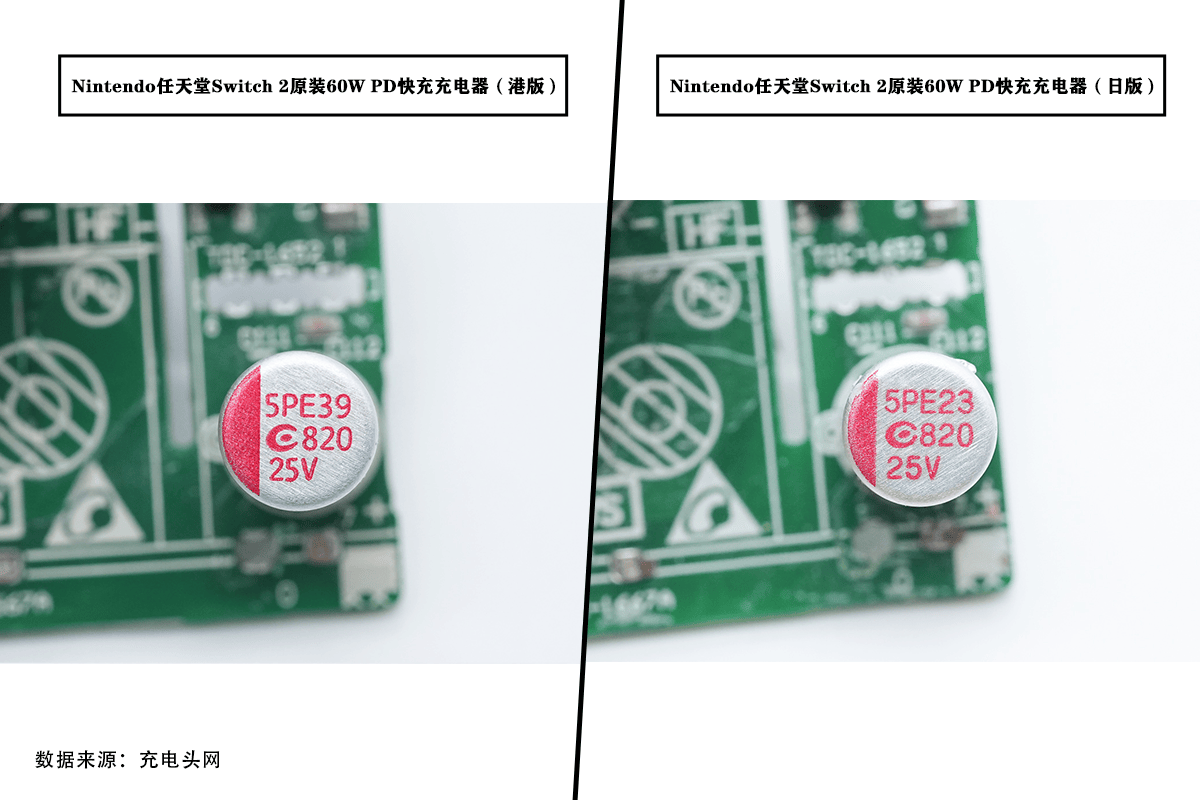 任天堂Switch 2原装60W快充充电器两个版本的输出滤波固态电容型号规格一致,均来自APAQ钰邦,规格为25V820μF。