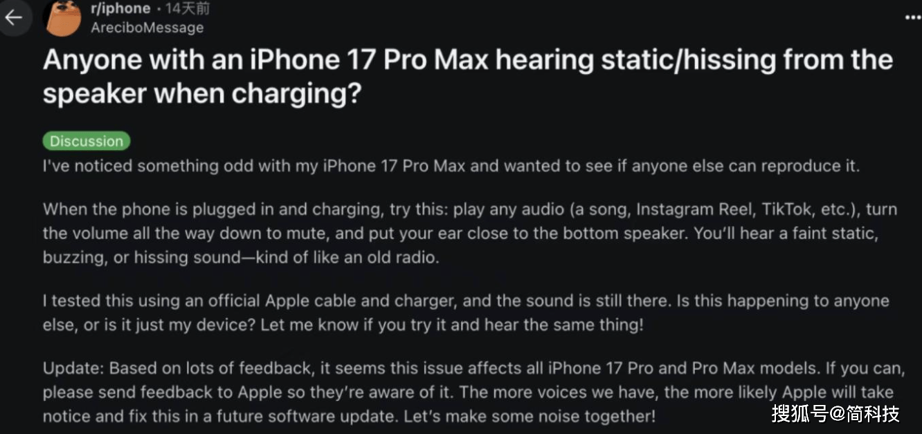 此前有网友反馈称,自己的 iPhone 17 Pro Max 机型在充电时有明显的电流声,就算将手机音量调低或使用静音模式,手机底部也会传出嗡嗡声或嘶嘶声,就算使用 MagSafe 充电,这个电流声依旧存在。