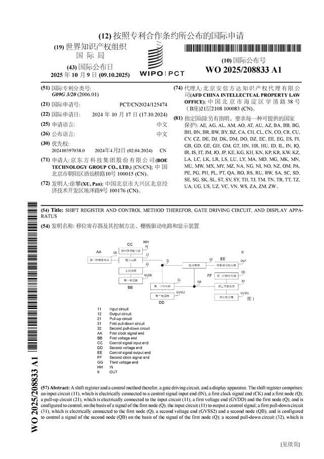 证券之星消息,根据企查查数据显示京东方A(000725)公布了一项国际专利申请,专利名为“移位寄存器及其控制方法、栅极驱动电路和显示装置”,专利申请号为PCT/CN2024/125474,国际公布日为2025年10月9日。