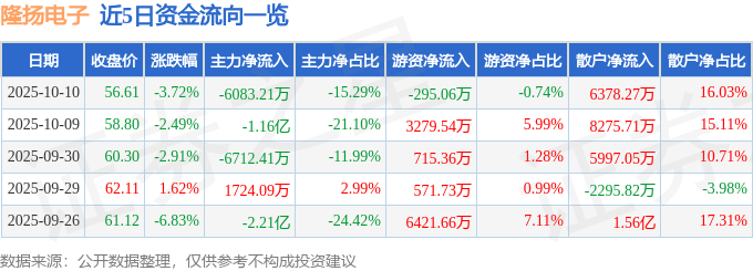 隆扬电子(301389)10月10日主力资金净卖出6083.21万元