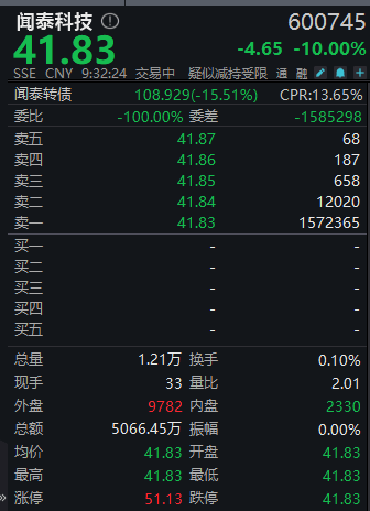 【大河财立方消息】10月13日,闻泰科技开盘一字跌停,现报41.83元/股。