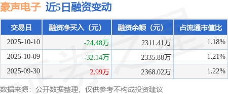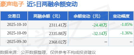 证券之星消息,10月10日,豪声电子(920701)融资买入31.52万元,融资偿还56.0万元,融资净卖出24.48万元,融资余额2311.41万元。