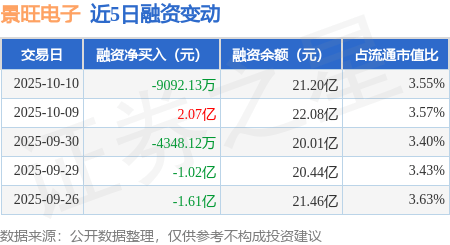证券之星消息,10月10日,景旺电子(603228)融资买入1.48亿元,融资偿还2.39亿元,融资净卖出9092.13万元,融资余额21.2亿元,近20个交易日中有13个交易日出现融资净买入。