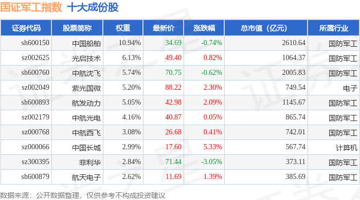 证券之星消息,10月13日,国证军工(399368)指数报收于8142.46点,涨0.79%,成交481.17亿元,换手率2.2%。当日该指数成份股中,上涨的有35家,联创光电以10.0%的涨幅领涨,下跌的有14家,华测导航以5.93%的跌幅领跌。