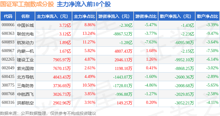 资金流向方面,国证军工(399368)指数成份股当日主力资金净流入合计3.43亿元,游资资金净流出合计7183.89万元,散户资金净流出合计2.71亿元。成份股资金流向详情见下表: