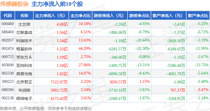 从资金流向上来看,当日传感器板块主力资金净流出35.31亿元,游资资金净流入6.72亿元,散户资金净流入28.59亿元。传感器板块个股资金流向见下表: