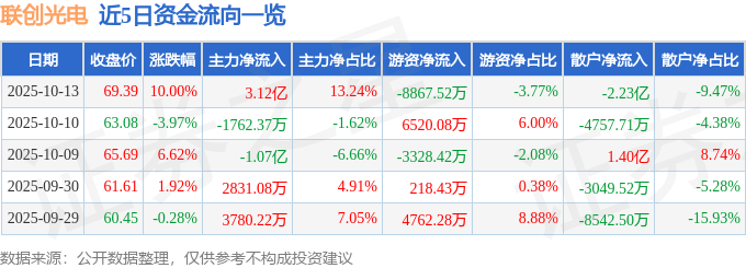 证券之星消息,截至2025年10月13日收盘,联创光电(600363)报收于69.39元,上涨10.0%,换手率7.86%,成交量35.63万手,成交额23.53亿元。