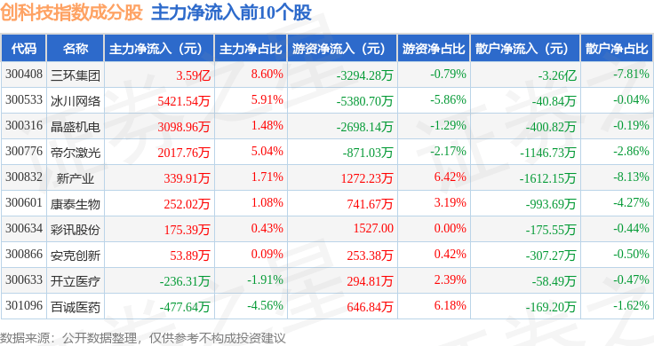 资金流向方面,创科技(399276)指数成份股当日主力资金净流出合计83.92亿元,游资资金净流入合计28.72亿元,散户资金净流入合计55.21亿元。成份股资金流向详情见下表: