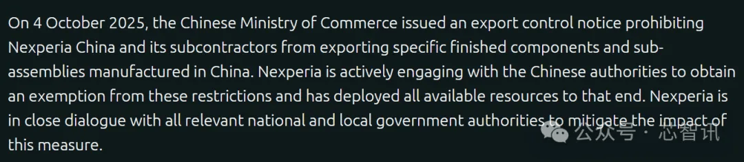 2025年10月4日,中国商务部发布出口管制通知,禁止安世半导体中国及其分包商出口在中国制造的特定成品元器件和子组件。安世半导体正在积极与中国当局接触,以获得这些限制的豁免,并已为此部署了所有可用资源。安世半导体正在与所有相关的国家和地方政府当局密切对话,以减轻该措施的影响。