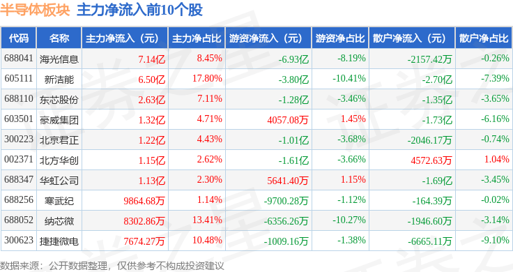 从资金流向上来看,当日半导体板块主力资金净流出46.55亿元,游资资金净流出2.33亿元,散户资金净流入48.88亿元。半导体板块个股资金流向见下表: