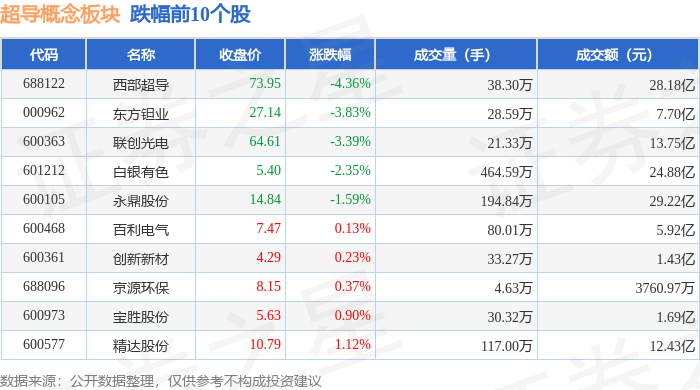证券之星消息,10月15日超导概念板块较上一交易日上涨0.15%,中孚实业领涨。当日上证指数报收于3912.21,上涨1.22%。深证成指报收于13118.75,上涨1.73%。超导概念板块个股涨跌见下表: