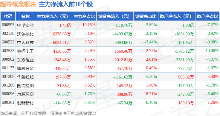 从资金流向上来看,当日超导概念板块主力资金净流出4.73亿元,游资资金净流入1.08亿元,散户资金净流入3.64亿元。超导概念板块个股资金流向见下表: