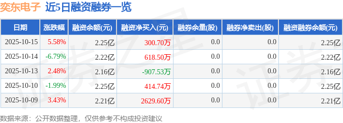奕东电子融资融券信息显示,融资方面,当日融资买入3992.96万元,融资偿还3692.26万元,融资净买入300.7万元。融券方面,融券卖出0.0股,融券偿还0.0股,融券余量0.0股,融券余额0.0万元。融资融券余额2.25亿元。