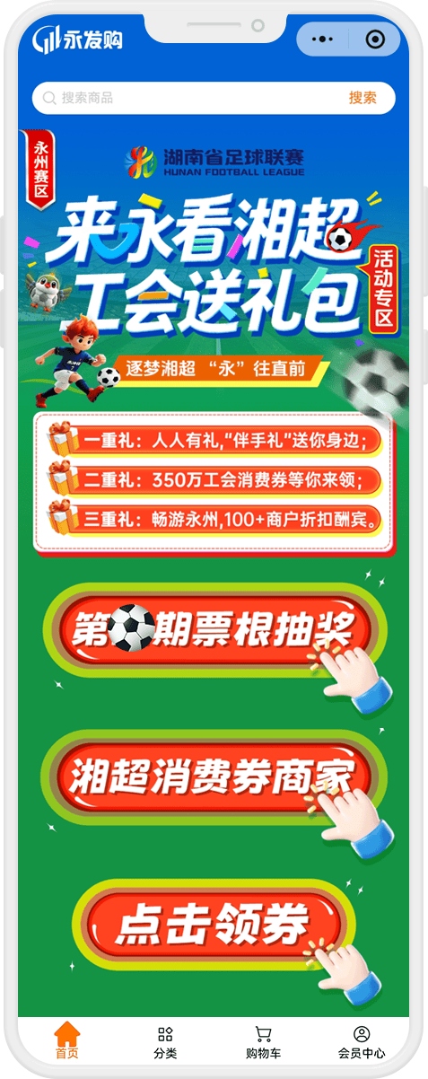 1、现场扫“永发购”二维码或搜索“永发购” 微信小程序打开【来永看湘超,工会送礼包】活动专区。进入【点击领券】抢券。抢券成功后可在“永发购”小程序“会员中心” → “我的优惠券”查看。