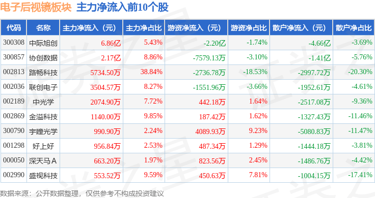 从资金流向上来看,当日电子后视镜板块主力资金净流出1410.13万元,游资资金净流入2.89亿元,散户资金净流出2.75亿元。电子后视镜板块个股资金流向见下表: