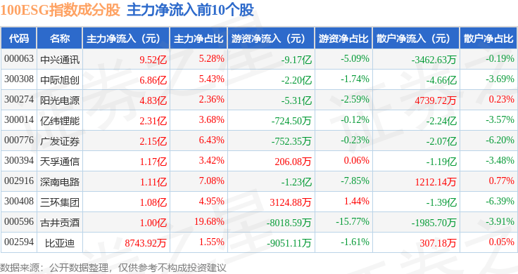 资金流向方面,100ESG(970027)指数成份股当日主力资金净流出合计46.1亿元,游资资金净流入合计5.42亿元,散户资金净流入合计40.68亿元。成份股资金流向详情见下表: