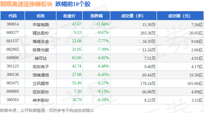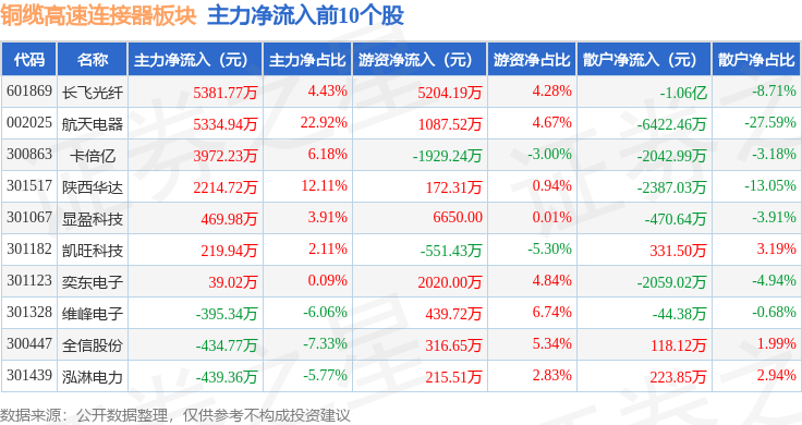 从资金流向上来看,当日铜缆高速连接器板块主力资金净流出32.9亿元,游资资金净流入12.34亿元,散户资金净流入20.56亿元。铜缆高速连接器板块个股资金流向见下表: