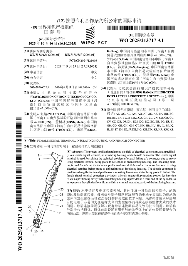 证券之星消息,根据企查查数据显示中航光电(002179)公布了一项国际专利申请,专利名为“一种母端信号端子、绝缘壳体及母端连接器”,专利申请号为PCT/CN2024/121003,国际公布日为2025年10月16日。