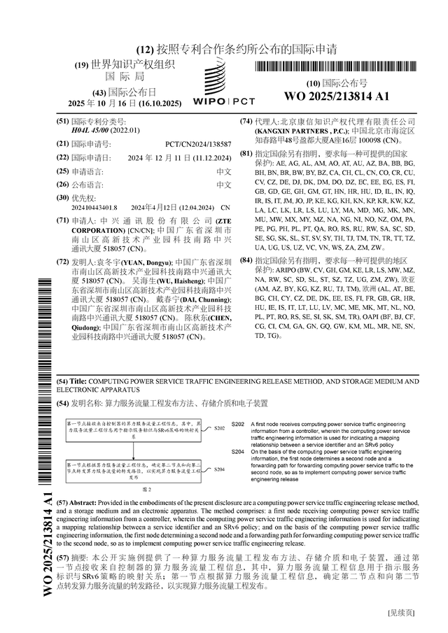 证券之星消息,根据企查查数据显示中兴通讯(000063)公布了一项国际专利申请,专利名为“算力服务流量工程发布方法、存储介质和电子装置”,专利申请号为PCT/CN2024/138587,国际公布日为2025年10月16日。