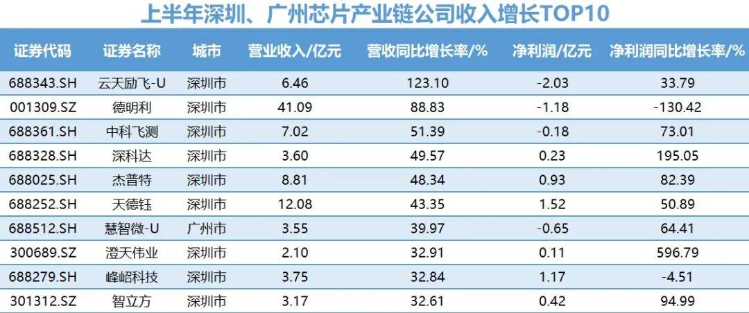 一个具象化表现是业绩明显增长。据界面新闻梳理,上半年注册地为广州和深圳的芯片公司中,不少呈现收入高增长:德明利增长88.8%至41.1亿元,云天励飞增长123.1%至6.5亿元,江波龙增长12.8%至102亿元,佰维存储增长13.7%至39.1亿元,兴森科技增长18.9%至34.3亿元。