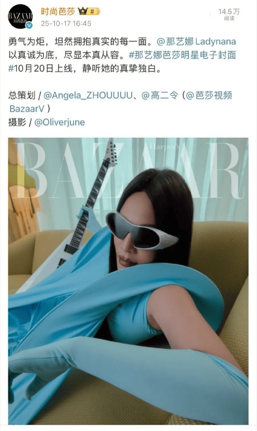10月17日,《时尚芭莎》官宣网红女歌手那艺娜(Lady Nana)为电子刊封面人物。18日,记者查询《时尚芭莎》微博账号,相关宣传物料不可见。