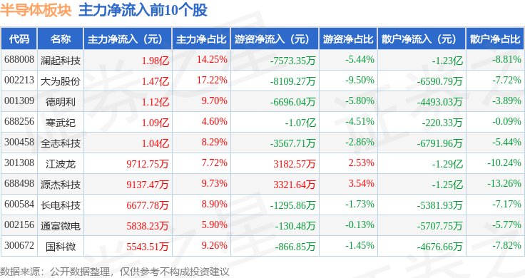从资金流向上来看,当日半导体板块主力资金净流入8.37亿元,游资资金净流出3.92亿元,散户资金净流出4.44亿元。半导体板块个股资金流向见下表: