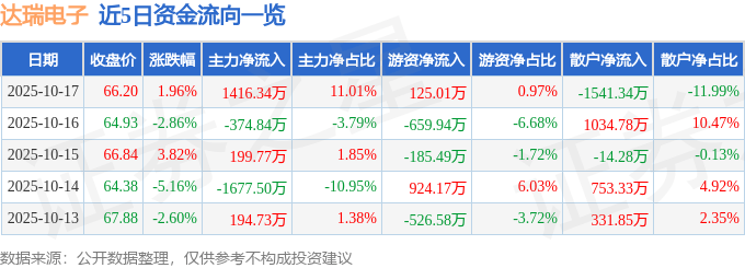 证券之星消息,截至2025年10月17日收盘,达瑞电子(300976)报收于66.2元,上涨1.96%,换手率2.29%,成交量1.95万手,成交额1.29亿元。