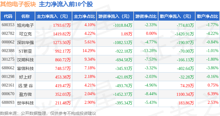 从资金流向上来看,当日其他电子板块主力资金净流出8.27亿元,游资资金净流入1630.01万元,散户资金净流入8.11亿元。其他电子板块个股资金流向见下表: