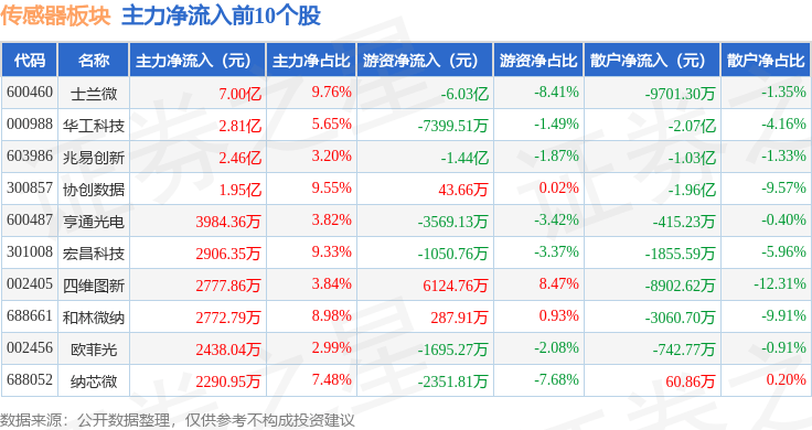 从资金流向上来看,当日传感器板块主力资金净流出3.85亿元,游资资金净流出9.54亿元,散户资金净流入13.39亿元。传感器板块个股资金流向见下表: