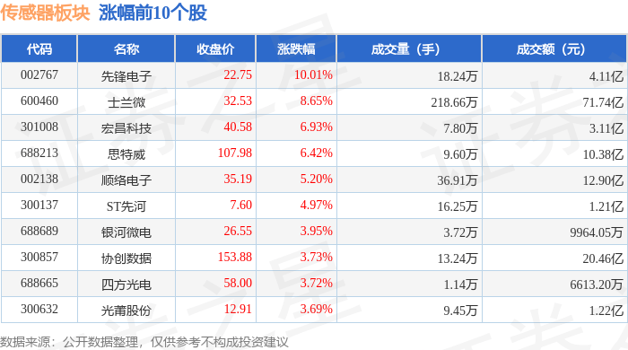 证券之星消息,10月20日传感器板块较上一交易日上涨1.45%,先锋电子领涨。当日上证指数报收于3863.89,上涨0.63%。深证成指报收于12813.21,上涨0.98%。传感器板块个股涨跌见下表: