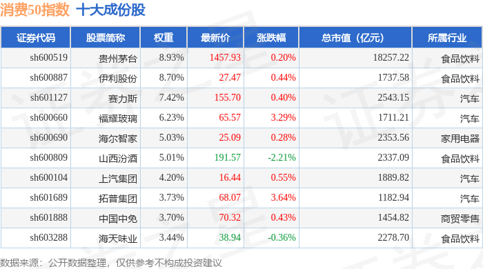 消费50(000126)指数十大成份股详情如下: