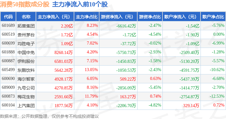 资金流向方面,消费50(000126)指数成份股当日主力资金净流入合计1.99亿元,游资资金净流出合计3.26亿元,散户资金净流入合计1.28亿元。成份股资金流向详情见下表:
