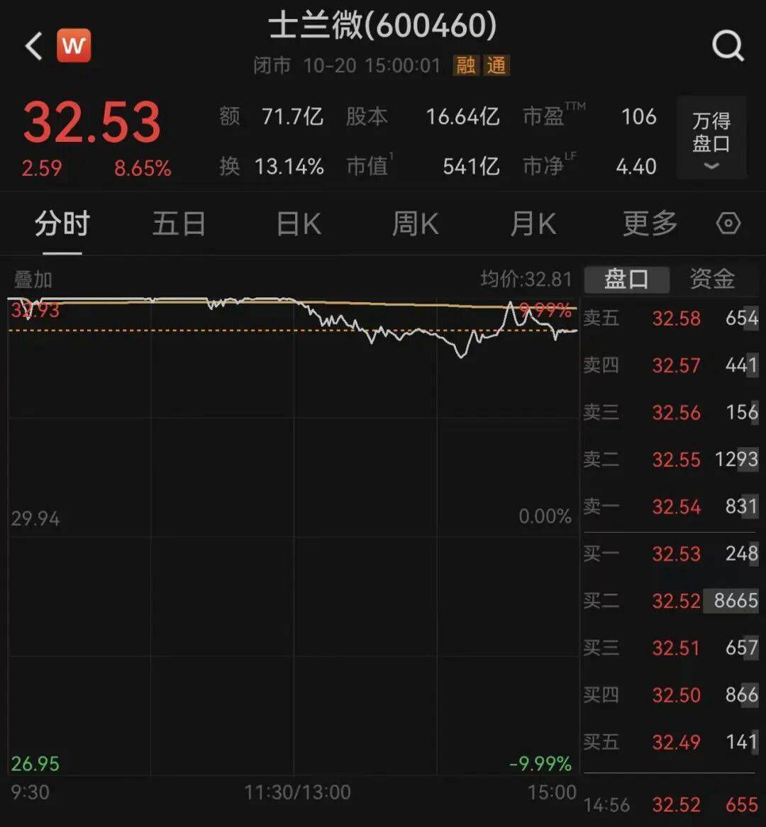 二级市场上,10月20日,士兰微股价开盘涨停,截至收盘,股价报32.53元,涨8.65%,最新市值为541亿元。